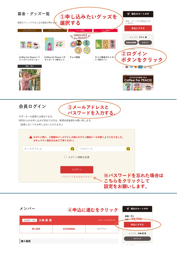 グッズ一覧ページ よりグッズを選択してから、ログインしてお進みください。
