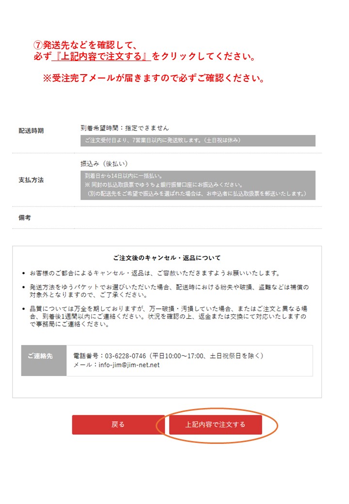 最後のページで配送先や申込数をご確認いただき、『上記内容で注文する』をクリックしていただきませんと完了となりません。