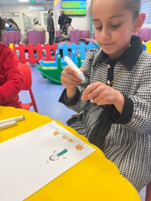 現在、院内学級は中止していますが、このような状況でも診察に来なければいけない子どもたち、入院中の子どもたちのために、アルビル(イラク北部クルド人自治区)ナナカリ病院の外来待合室のプレイコーナーは続けています。